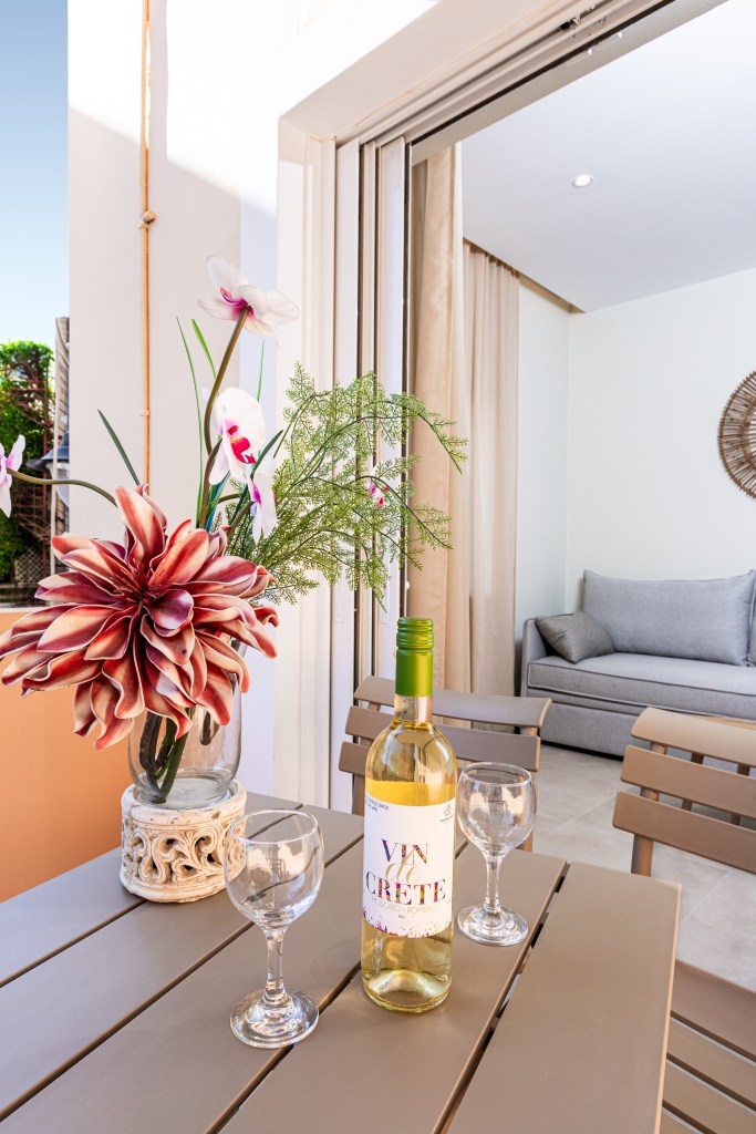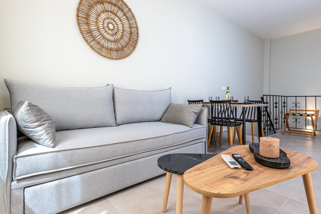 This new modern maisonette apartment consists of two main (levels). At the ground level you will find a fully equipped kitchen with a dining table for 4 persons and a large 3 seats sofa-bed with a detachable bed. A large 43 inches smart android TV with Netflix is also included and of course free Internet WiFi connection. At the same level a large modern bathroom with toilet is located and also a smal balcony where you can relax.